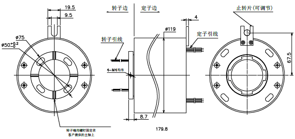 緊定螺絲固定。定子部分通過(guò)止轉(zhuǎn)片與設(shè)備固定部位連接。 |